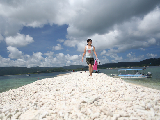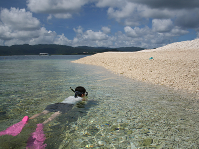 | 西表島の西部から鳩間島の方角を望むと、珊瑚礁の海に真っ白に輝く小さな砂浜が浮かんでいます。これがバラス島です。バラスとはサンゴの欠片、つまり、この島は真白なサンゴの欠片の集合体です。潮流の影響でバラスが1ヶ所に集まり、島が形成されましたが、それだけに台風の後などは島の形が変わってしまう不思議な島です。周辺の海域は、まさに自然の水族館、透明度も高く、八重山屈指の珊瑚礁が広がっています。今回、このバラス島とTVドラマ“瑠璃の島”のロケ地としても有名な鳩間島の2つの美ら海を巡る平田観光主催「エメラルドに輝くバラス島&鳩間島シュノーケルコース」を体験してきました。コースの出発は石垣港ターミナル、平田観光でチケットを受け取ります。親切なことに、ここでマリングッズを入れるのに便利な平田観光オリジナルナップサックとレインコート、サンゴから手を守る手袋をを貰いました。高速船で40分上原港へ。現地スタッフが看板を持って待っています。事務所でガイダンスを受け、20人乗りのボートに乗り換え、バラス島に向かます。船上から見るバラス島は、太陽に照らされ真っ白に光っています。上陸して驚いたのは、その広さ、サンゴの欠片の集まりということなので、てっきり小さい島と思っていましたが、数艇のボートが付いて、数十人が上陸してもゆったり遊べる広さです。ガイドの方に、ポイントの説明を聞いて浜からエントリー。驚くほどの透明度!バラス島で、たっぷり遊んだ後、次のポイントへ。2本目のシュノーケル以降は、その日の天候・干満・お客様のレベルに合わせガイドの方が判断してポイントを決めます。今回は鳩間西のポイントへ。ボートからのエントリーです。浅めの海の中は、色とりどりのサンゴと熱帯魚の共演。2本潜ってお腹がすいた頃、鳩間島に向かいます。ここでまた驚いたのが、お昼の本格的バーベキューとそのボリューム!コースの食事はお弁当やセットメニューが普通ですが、シューケルを3ヶ所周るツアーは、スタミナが大事だからでしょうか?食後は、ゆったり鳩間島を散策。ガイドの方が、「鳩間島では、生きた星砂が見れるよ!希望があれば案内します。」とのこと。お昼が干潮時にあたる場合は、歩いて10分の「船原の浜」まで案内してくれるそうです。3本目のポイントは、海の状況にもよりますが、今回はダイビングポイントで有名な「カスミの根」。水深もあり、また違ったシュノーケリングを楽しむことができました。 |