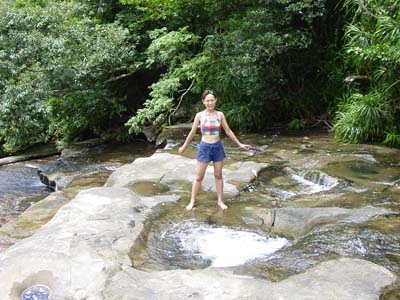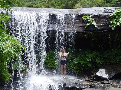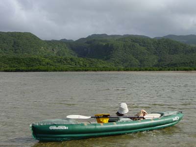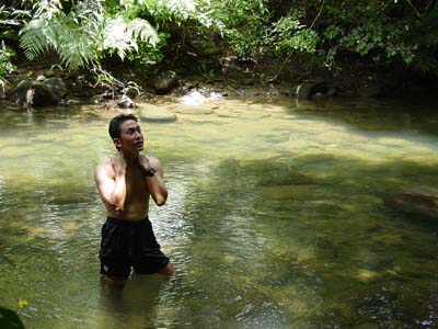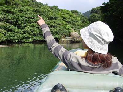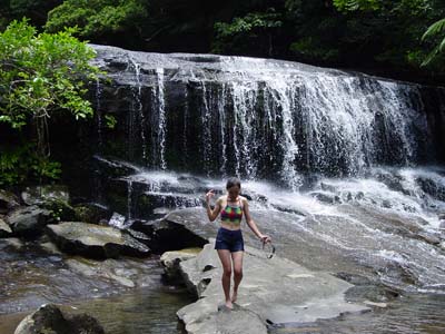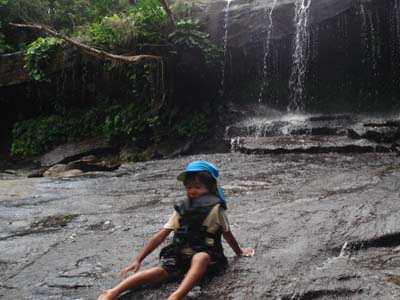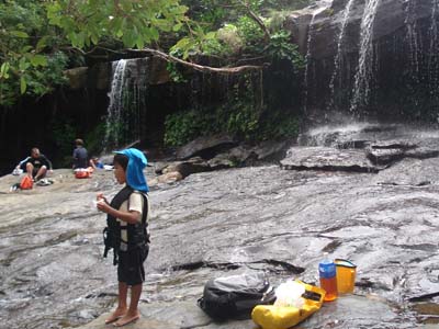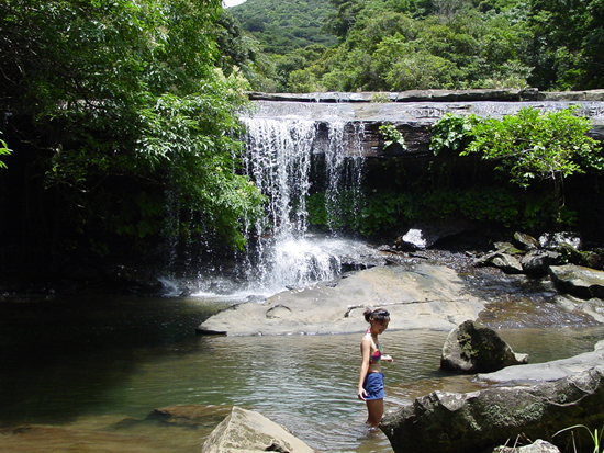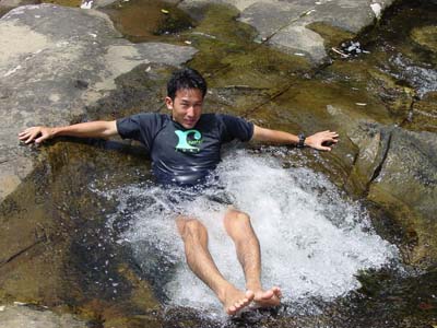 | 船浦湾の西田川上流にあるサンガラの滝。ガイド付きのツアーがでていますが、ここは愛用のゴムカヌーで遡ります。ゴムカヌー(インフレータブルカヌー)は重さが10kg程度、折りたためた持ち運び便利、空気入れがあればどこでも膨らますことができ遊べる優れものです。難点は風に弱いこと。すぐに流されてしまいます。出発地点は船浦湾の大橋を渡りあたり。ここから、目の前にピナイサーラの滝を眺めることもできます。出発地点は船浦湾内になるので、風が強い時は厳しい。西田川に入ってしまえば安心です。川は短いのでカヌー置き場まではすぐ。そこから10分間のジャングルトレッキングで滝へ。西田川の滝(通称サンガラの滝)は落差はあまりないけど横に長く、滝つぼもあり、滝に打たれることもでき、滝に裏側にも入れる面白い滝です。滝上の岩盤に流れによってできたポットホールという穴があり、そこに入ると天然ジャグジーみたいでとても気持ちがいいです。 |