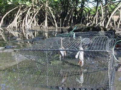 大潮の干潮時にマングローブの中の、ガザミがいそうな所にカゴを仕掛けます。
