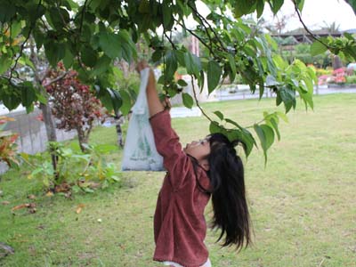 | 枝をゆすって、熟した実を落とし拾います。 |