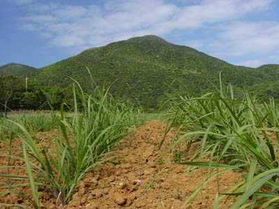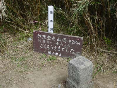 | 標高526m八重山だけでなく沖縄県で1番高い山です。信仰の山でもあり中腹と山頂にはお祈りするところがあります。そのためか地元の人もよく登り、登山道も歩きやすく階段などもあり迷うことはありません。途中丸木橋や小さな滝もあり熱帯林を観察しながら歩くとすぐに頂上に着きます。(登山道より入口までの林道方がわかりずらい。桟橋通りを北上し、於茂登集落のところを左に曲がり林道に入ります。ここの看板を見落とさないように!)頂上はリュウキュウチクにおおわれていて、比較的平らでそれほど見晴らしはよくありません。頂上の看板がある方とは別の鉄塔側の奥に行くと石垣島の東側の景色がきれいに見えます。登山を楽しむというより、南国石垣島の植物層、動物層が観察しながら楽しむコースです。麓付近を走る嵩田・於茂登は昆虫採集するのに最適の場所で、大きな捕虫網を持った人をよく見かけます。 |