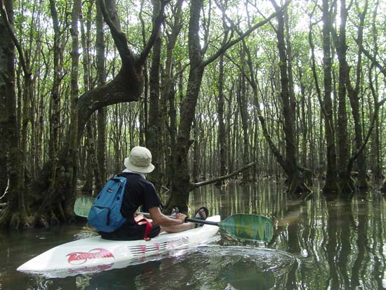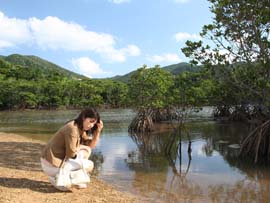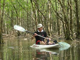 | 石垣島は西表島ほど大きな川は多くありませんが、その中でも比較的大きく、マングローブがあり、きれいなのが野底にある吹通川です。ここは特にカヌーで川を上るのがおすすめです。1時間〜2時間で見れる手頃なコースで、危険もなく静かなマングローブの中をゆっくり進むことができます。カヌーを扱っている業者はのそこ観光。午前、午後のコースがあり、市内から送迎もついて、5,000円(カヌー+海上散歩)〜6,000円(カヌー+シュノーケル)です。吹通川はカヌーをしなくても、駐車場から歩いてマングローブに降りられ、生き物観察もできますよ。 |