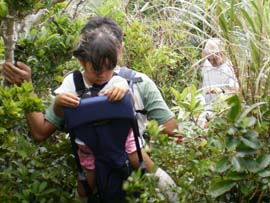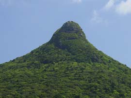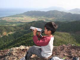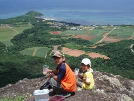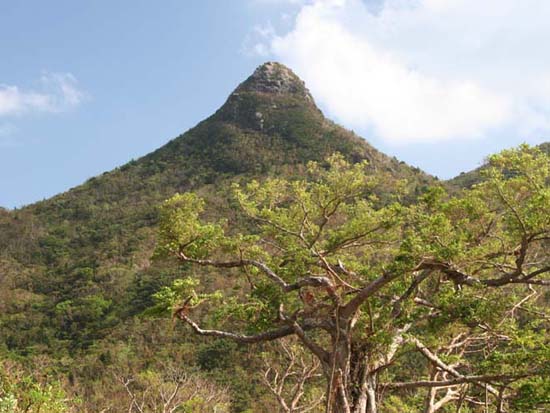| 標高282m、地元では野底マーペーと呼んでいるとても変わった形の山です。登山口は2つあります。その1つ、野底集落の奥にある麓からの登山道。途中が急でロープが張ってあったりもしますが、1時間ぐらいで頂上に登ることが出来ます。石垣島の森を麓から楽しめる森林浴コースです。山岳会の方の案内板があるので、道は迷うことはありません。もう1つは、野底林道の途中から登るコース。ここからだと15分で山頂に着きます。3歳の子供でも1人で登ることができました。(下りは抱っこでしたが・・・)頂上付近はイタジイ中心の原生林が広がる美しい森です。山頂は断崖絶壁になっていて眺めは石垣島の山の中で最高です。晴れた日には、平久保半島が一望でき、その周りを取り囲む珊瑚礁がはっきり見渡せます。また、於茂登岳の方向を見ると石垣島はこんなにも山が多いのかと思うほど山だらけです。 |