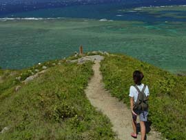 | 石垣島最北端の岬です。晴れた日には宮古島と石垣島の間にある島、多良間島を見ることができます。沖にある島は小さな無人島、大地離島です。平久保崎に行くまでは牧場が広がり、岬からは東シナ海の大パノラマと真っ白な灯台が印象的な景色です。ここでは、コマーシャル撮影なども行われています。眼下に見えるきれいな浜は平野の浜で、一度一周道路に戻り、さらに北を目指すと最北の集落、平野があります。ここから左に曲がり坂を下ると岬から見えたきれいな浜に出ることができます。 |