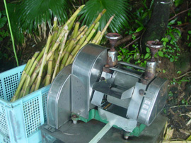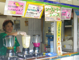 | 米原のヤシ林のすぐ横にあるお土産屋とオリジナル生ジュースのお店ぱぱ屋、ここのパインジュース(400円)は最高です。写真のようにさとうきびをその場で磨り潰し、その汁とおいしいパインをジューサーで混ぜたパインジュースはまさに絶品の味、石垣島に遊びに来た友達には必ずすすめるお店です。ちなみにパッションフルーツジュース(400円)もおすすめです。もちろんここまで来たらヤシ林にも足を運んでください。 |