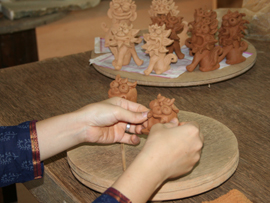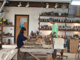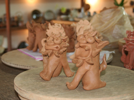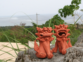 | 沖縄県で見られるシーサーは、伝説の獣の像で、その起源は、スフィンクスや中国の石獅、日本本土の狛犬などと同じく古代オリエントと言われています。建物の門や屋根、村落の高台などに据え付けられ、家や人、村に災いをもたらす悪霊を追い払う魔除け、幸運招きなどの意味を持っています。名前は「獅子(しし)」を沖縄方言で発音したもので、八重山ではシーシーともいう場合もあります。今回シーサー作りを体験した川平焼 凛火は、石垣島の吉原地区の高台にあり、眼下には国立公園の川平湾が一望でき、裏手は、沖縄最高峰の於茂登山塊が連なる大自然の中、絶好の環境の中にある工房です。代表の渡邊さんは沖縄本島の焼き物の本場、読谷で3年半修行を積み、沖縄の代表的な焼き物である壺屋焼の技法を学び、2004年この地に凛火をオープンさせました。土は鉄分を多く含む石垣島のものを3種類混ぜ、それと壺屋の伝統技法とオリジナルがマッチし、作品には独特の雰囲気があります。シーサーの手作り体験は、まず自分が作りたい作品を、立体シーサー、壁掛けシーサー、香炉・灰皿シーサーから選びます。それぞれ土台となる体の部分が用意され、そこに各パーツを自分好みのものや、プロの作品を真似て作り、接着剤にあたる粘土(ドベ)で付けていきます。模様や線などは、竹くしを使い粘土に刻んでいきます。スタッフが付いて丁寧にアドバイスをくれるので、初心者や子供でも安心して楽しむことができます。通常1時間〜2時間で出来上がり。後は季節によりますが2週間ほど乾燥させ、1240度の窯で14時間焼いて完成です。3種類の粘土配合の割合と焼く温度によって、出来上がりのシーサーが赤いものと黒いものに分かれるそうです。季節によってどちらか選べる場合とそうでない場合があります。自分で作ってから約1ヶ月後、郵パックで手元に届きます。 |
