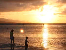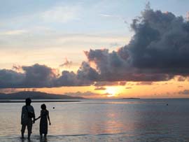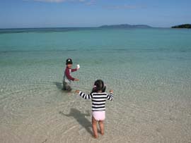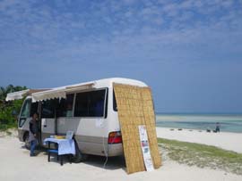 | 竹富島での海水浴といえばこのコンドイビーチ。まぶしいほどの白い砂と遠浅の美しいビーチです。ここは沖までずっと砂地なので、熱帯魚やサンゴなどを観察するには不向きです。のんびり海水浴か、ゴーグルを着け水泳の練習とかがいいですね。大潮の干潮時はかなり潮が引くので、沖まで出ないと泳げません。夏の期間(4月頃〜10月頃まで)はパーラーが出て、飲み物や軽食、浮き輪やパラソル、シュノーケルセットのレンタルなどしています。(ゆたかパーラー 営業時間 9時30分〜16時 不定休) |