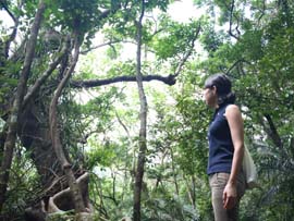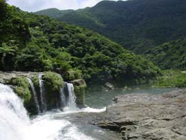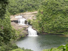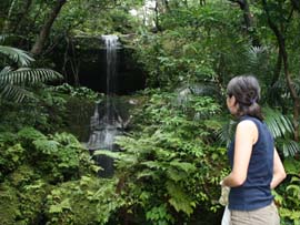 | 日本の滝100選にも数えられているマリユドゥの滝。マリユドゥとは円い淀みという意味です。落差16m、幅20m、3段になって落ちる滝です。浦内川上流にあるので、まずボートで船着場の軍艦岩へ行き、そこから30分、1.5km歩くと滝が見れる展望台です。(左の写真が展望台からの眺めです。他に観光のある急ぎの人はここで引き返します)さらに10分、400m歩くとマリユドゥの滝です。軍艦岩から滝までの道のりは川の横を歩くゆるい登りです。未舗装ですが、大勢の観光客が訪れるので、しっかり踏み固められています。滝周辺の岩場は凄くすべる所があるので注意が必要です。すべって滝に落ち、大怪我した人もいます。サンダルやヒールは避けたほうが無難です。 |