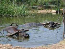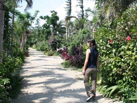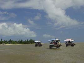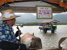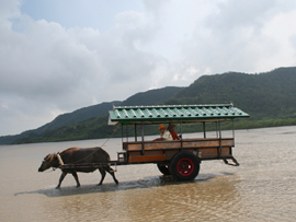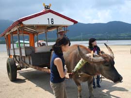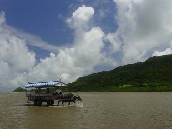 | テレビのCMで使われたこともある水牛に乗り海を渡って行く由布島。西表島の沖合い400mに浮かぶ周囲約2kmの小さな島です。水牛に揺られながら、おじさんがサンシンを弾き、沖縄民謡を唄ってくれます。島は全体が亜熱帯の植物園になっていて、リスやいのしし、クジャクなどの動物もたくさんいます。また、南太平洋の島々の民俗資料館や貝の資料館など、そちらの方面の興味のある人は何時間でも楽しめる島です。大きな土産屋や食堂もあり、西表島を周るツアーは、ほとんどコースに入っており、年間20万人が訪れる八重山屈指の観光スポットです。入園料は往復水牛渡しも入れて大人1,300円です。 |