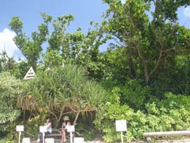 | 陸の孤島、船浮集落の裏手にある浜がイダの浜です。真っ白い砂でできた弓なりの浜です。少し前までは、あまり人の来ない静かな浜でしたが、平田観光が石垣島からの日帰りツアー、船浮と内離島探検コース(大人17,500円、子供12,300円)を作り、観光客にも知られるようになりました。それでも、コースの人は昼間の数時間だけで、後は静かな浜です。船浮には民宿が数件あるので、1泊してゆったりと過ごしたい浜です。 |