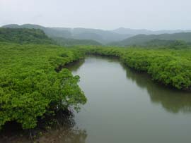 西表島の古見集落には、前良川、後良川、相良川の比較的大きな3つの川が流れ込んでいます。そのなかでも河口からの眺めが1番きれいなのが後良川です。そのためか、1周道路沿いに川を望むあずま屋と古見を唄った石碑があります。ここからは、美しいマングローブと古見岳を中心とした西表の山々を見ることが出来ます。