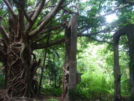| 明治の初めから、第二次世界大戦後まで、60年あまりの歴史を持つ西表島最大の炭鉱跡。栄えた時期には、映画館や芝居小屋などの娯楽施設もあってという。西表の炭鉱で働いた人は、過酷な労働やマラリアで死んでいった人も少なくないそうです。遊覧乗り場からは、しっかり踏み固められた山道がありますが、一人で行ったり、サンダル履きで行かないほうが無難です。観光化はされておりません。 |