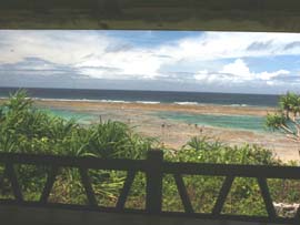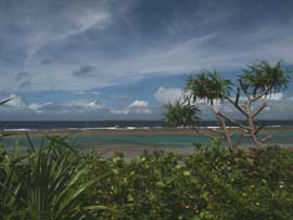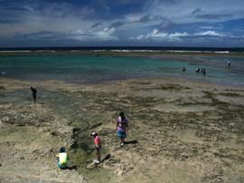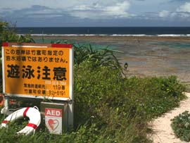 | 黒島で一番人気の場所、仲本海岸。人気の秘密はシュノーケルに最適なこと。潮が引くと外洋まで歩いて渡れる2本のリーフが現れます。その間の内海は天然のプール。透明度もよく、波や流れもなく、また餌付けポイントもあって、ソーセージなどを出すと、熱帯魚が集まってきます。リーフの外は流れが速いので、慣れてない人は行かないほうが無難です。ビーチ入り口には「南見家」があって、ビールやジュース、カキ氷、それにシュノーケルセットのレンタル(1,500円)もやっています。 |
