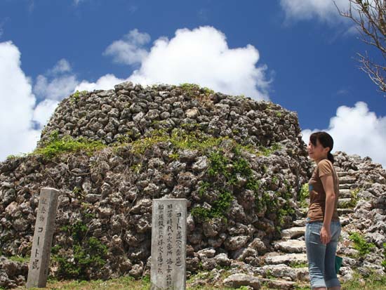 琉球王府時代に海上を通る船を監視したのがこのコート盛です。竹富島のクスクムリや黒島のフズマリなどと同じ役割を果たしていました。石灰岩をらせん状に積み上げただけのものですが、標高の低い波照間島の中では高い位置にあり、上からはさとうきび畑ののどかな風景と青い海の向こうに西表島が見えます。また、方位として使った十二支を刻んだアザミサンゴが置かれています。