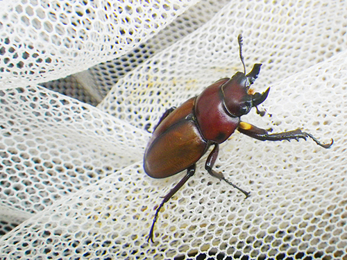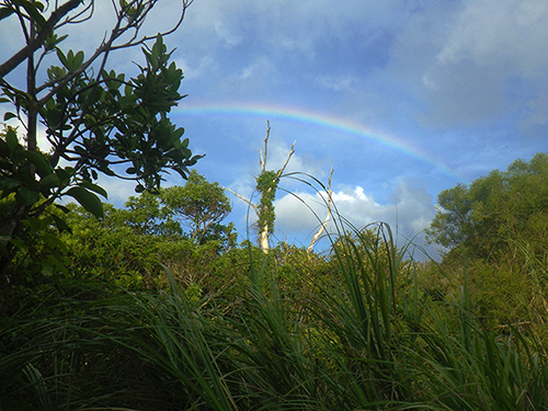 チャイロマルバネクワガタを捕まえに行く日は、いつも9時頃林道に向かうのですが、探し始めてすぐに枝先にとまっていたりする。このチャイロマルバネクワガタは朝、根元から登ったものなのか、それとも昨日から枝先にいたのか気になる。そこで今日は仕事前、朝6時半から林道に行ってみた。今日の石垣島の日の出は6:35。しかし、全然見つけられない。朝早くはやっぱり難しいのか・・・探し始めて1時間、そろそろタイムリミット。するとススキ原に生える3mほどの木の枝先で1頭確認。これはきっと昨日から枝先でじっとしていたチャイロマルバネクワガタだろう。スコールが降って虹が出た。