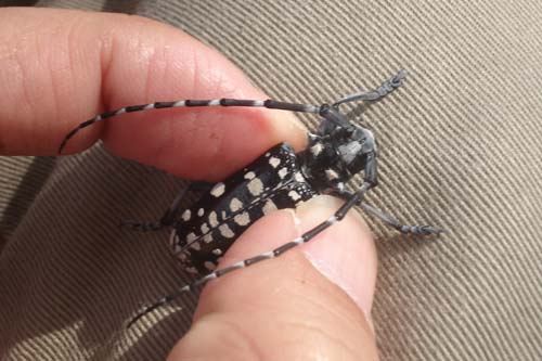 そんな中、お弁当を食べた広場で、比較的大きなカミキリが飛んでいた。走って追いかけると木に止まってくれた。石垣島では初めて見るゴマダラカミキリだった。シークァサーの木に付く害虫と聞いているが、今まで見たことがない。大きなカミキリに子どもも大喜び。