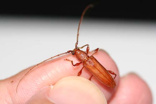 今年から始めた念願の発電機によるライトトラップ2回目。昼間暑かったものの、晴れすぎて夜涼しく、虫はあまり集まらなかった。よく見かけるコフキコガネやコメツキなどの中で、唯一の大物。リュウキュウイビイロカミキリ(多分)。大物といっても15mm。子どもが見つけたので大喜びでした。トビイロカミキリではなく、だれか本当の名前を知っていたら教えてください!