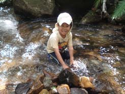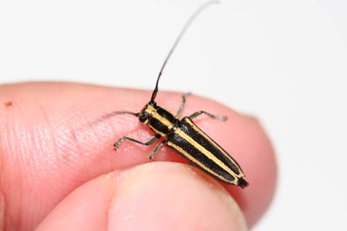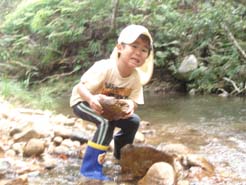 | 昨日、浦底林道でいっぱいカミキリを捕まえました。連休2日目、今日も虫とに行きたいけど、子供はどうも魚釣りモードらしい。釣りも楽しいけど、潮や季節によって釣れなかったりするし、色々準備も必要なんだよなぁ〜。今日は日が悪そう。そんなことを子供に話してもどうしても釣りモード。それなら、川にエビ釣りに行こうと誘ってみた。子供の頭の中に去年、白水でいっぱいエビを釣った楽しい記憶が甦り「エビ釣りがいい!」と。うふふ、白水なら、森の中だから、虫もいっぱいいるはず。伊野田から少し遠いけど白水へレッツゴー!車を止めて目的の河原までは10分程の山道。エビ釣りと虫取りの道具で両腕が満杯。河原に付きまず子供が喜ぶエビ釣りを開始。しかし、餌を練り餌のしたせいか、すぐ餌が落ちてしまいエビは見えるけど全然釣れない。ちなみに去年は、サンマを使い大きなテナガエビを20ひき程釣ってから揚げにした。子供も途中から釣りを止め、川遊びに変更。ここはほっとおいても危なくない川なので、そっそく近くの木を叩いて見ることにした。そこで落ちて来たのが、今まで見たことのない縦縞模様のカミキリ。お家でNETで調べてみるとイワサキキンスジカミキリらしい。 |