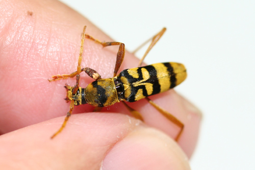 今日は子どもの一番の友達、3つ年上のS君を連れて野底林道へ虫捕りに行きました。はじめにクワガタのパイナップルトラップを見ましたが、昨日いっぱい捕まえちゃったので今日の成果はメス1匹。これでは、子どももお友達も納得しないので、とりあえず周りの木を片っ端からビーティング。そのはじめに落ちてきたのが、このヨスジトラカミキリ。これにすごく似ているイリオモテトラカミキリは、去年2匹捕まえたけど、ヨツスジトラカミキリは初めて!子どもは、トラカミキリが大好きなので大喜び。お友達は、こらハチじゃないの?と心配してました。