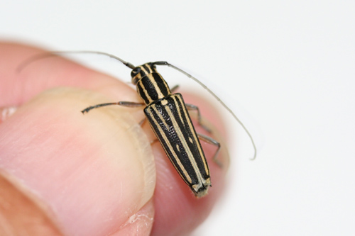今日はハーリーでした。私も職場で参加。そのため、虫捕りは夕方からになりました。2週間前に仕掛けたパイントラップをチェック。サキシマヒラタクワガタを20匹ゲット。すると、子どもがすぐ横のイタジイに付いているカミキリを発見。前に白水で見つけたイワサキキンスジカミキリに似てるけど、点々はなかったような?家で調べると初めて捕まえるイシガキスジシロカミキリとの事。やったね!
