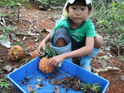 毎年恒例のパイナップルトラップを行いました。今年はちょっと少なめ。多分、パイナップルの種類や糖度に原因がありそう。切って少したった後、周りまでプンプンにおうものがいいのだけど、今年はあまりにおいませんでした。それでも、3日間で20匹ほど捕れたので、子どもも私も大満足。友達が遊びに来るたび、みんなに見せてます。