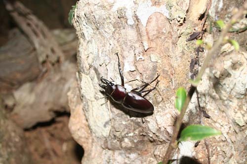 今日も今年はじめて夜入る谷。ここは、野底の中でも比較的大きな谷なのですが、乾燥化が激しいので、後まわしにしてました。大きな谷から、いくつかの小さな谷に分かれ、その両際に大きなイタジイが点在している。それを1本1本見て回るが、どれも乾燥している。途中、パサパサの乾燥したイタジイでどうにか小歯1匹を確認。45mm小さい。でも、ボウズでなければ、来たかいがある。帰りは大雨。大谷から分かれた小谷に入っていると方向感覚が無くなる。途中で迷い、初めてコンパスを使って戻ってきた。