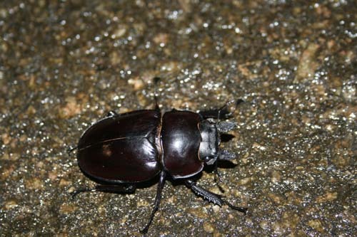 夕方に少し雨が降り、路面は濡れている状態。ヤエヤママルバネクワガタのドライブ採集は、この状態だと非常に見つけにくい。路面が黒く照らされるので、車のライトで黒く光るヤエヤママルバネクワガタがわからないのです。それでも、歩いているヤエヤママルバネクワガタを発見。メス51mm。これで四夜連続で歩行のヤエヤママルバネクワガタを確認。月夜で歩行もピークなのかなぁ〜?