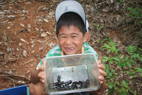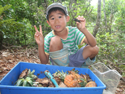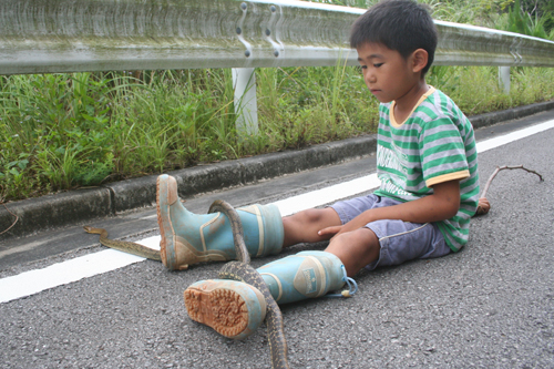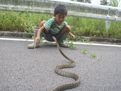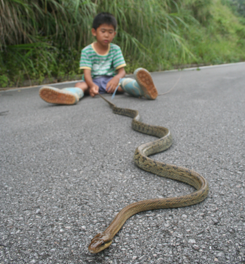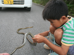 毎年恒例のパイナップルトラップを行いました。3箇所仕掛けて約30匹。おもしろいのは、5mしか離れてない場所に、全く同じトラップを1つづつ仕掛けた。違うのは、西の開けた斜面と南に開けた斜面。そのちょっとした位置だけ。片方には、20匹採れて、もう片方は0だった。風によってにおいの漂う方向が違う。それだけで、この成果の違い。パイントラップは、数mの場所の差で、大漁だったり、ぼうずだったりします。帰り道、野底林道で大きなサキスマスジオを見かけた。大きさ約170cm。子どもは大変興味を持ち、じっくり観察。1時間ほど、サキシマスジオの遊んでもらった。クワガタより、こちらの方がよほど楽しかったらしい。その午後、近所の子どもたちを連れてまた野底林道に虫採りに来た。狙いは、チャイロカナブン。この時期、午後3時以降になるとブンブン飛んでいる。10匹ほど取れた。他に捕まえた昆虫。アカメガシワにいたミドリナガボソタマムシ。たくさんいた。緑光沢の大きなコメツキ。名前なんだっけ?樹液にきたヒラタクワガタ。おなじみにキボシカミキリ、ゴマフカミキリ、ヒゲナガカミキリ、クロカタゾウムシ、キマワリ数種、こんなとこかな。