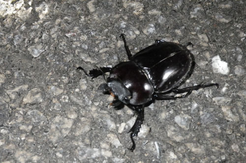 今年10月に降った記録的な大雨で、石垣島の林道の殆どが土砂崩れで、通行止めになった。そんな訳で、夜の森行きは、ほとんど出掛けなかった。11月の後半になり、ヤエヤママルバネクワガタは、イタジイの木から離れ、歩行の時期。この林道での歩行個体を探すのなら、息子もいっしょにヤエヤママルバネクワガタを探すことができる。通行止めを避けながら、林道をゆっくり車で走る。すると、黒い影。ヤエヤママルバネクワガタのメス。子どもは、初ヤエヤママルバネクワガタ採集で、いきなり初ゲット。この確立は凄い!やったね。