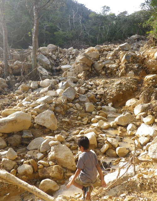山に詳しい人から、10月の大雨で於茂登登山道が凄いことになっていると聞いた。大雨前の10月前半、子どもとは、於茂登岳の山頂まで登っているので、どんなに変わった見に行くことにした。いやー凄い。ここまで、変わるとは・・・。以前は、登山道に沿って、小さな川が流れ、小さな滝があった。この10月、この滝で子どもと遊んだ。それが、全て無くなっている。5m程のあった川が流れる谷が全てえぐられ、周りの木もなぎ倒され、谷の幅が20mほどになっている。どこから来たのか、大きな花崗岩がゴロゴロしている。多分、地中に潜っていたものが、大雨で地盤が流され、現れたのだろう。それにしても、凄い変わりようだ。驚きながら、子どもと川筋を歩いていると、死にかけたヤエヤママルバネクワガタを3匹も見つけた。昼間、見つけたのは初めてである。たまたま、歩行していたのだろうか?林道なら見つける前にカラスに食べられている。何でここでヤエマル?と思わせる出来事だった。