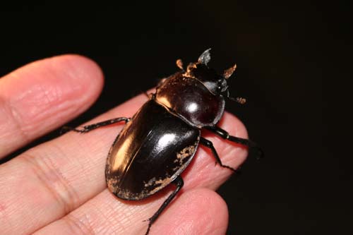 まずは、野底林道へ。路面を凝らして見るがゴキブリばかり。その中で少し厚みのある個体が目に止まった。どうせゴキブリと思いつつも、一応降りてライトを照らす。おっ、ヤエヤママルバネクワガタの雌♀だ。泥まみれだけど、しっかり元気。あの大雨に耐えたんだなぁ。