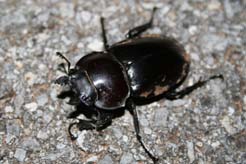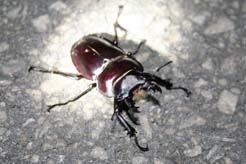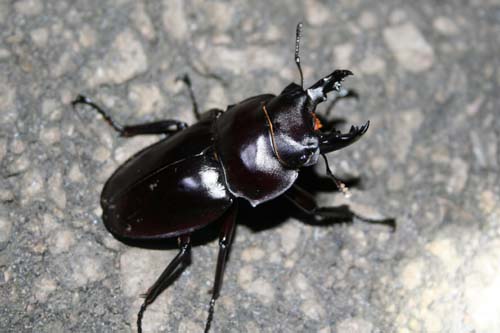 よし、次は浦底林道。ゆっくり低速で進む。すると、明らかにヤエヤママルバネクワガタの姿。歯を上に突き上げ、道路中央で構えている。けっこう大きい雄♂中歯。