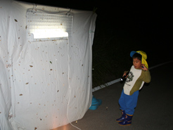 | 約1ヶ月ぶりのライトトラップ。ちょっと前に、夜ここに来たら、ヤエヤマウスバカミキリやニッポンムネヒダカミキリなど、憧れのカミキリを採っている人がいて、今日は子どもとちょっと遅くまでがんばろうとやって来ました。過去3回は、いずれもあまり虫が来ず、子どもは眠くなり1時間で退散。今回は、子どもも「眠くなったら、一人車で寝るから、父ちゃん遅くまでがんばって」と張り切っています。今日は日も良いらしく、私たち以外でも、あと3組ライトトラップをしています。その中の一人は、この前話した人。子どもとその人のを見に行ったら、さっそくヤエヤマウスバカミキリをゲットしてました。子どもは、「いいなぁ〜いいなぁ〜」の連発。なかなか私たちのトラップに来ないので、少しふてくされ気味。子どもは21:30頃、「車で寝るから、採れたらおこして!」と言って車の中へ。でも気になるらしく、寝れないようです。すると、私に目の前に、大きい虫が「ガシッ」と音をたてて着陸。念願のヤエヤマウスバカミキリでした。子どもはを呼ぶと、車から飛んできて、大喜び!やっと納得のいく成果がでました。 |