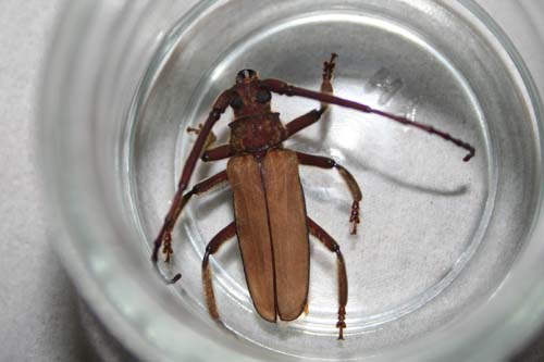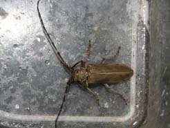 久々のライトトラップ。こどもは昼間運動会の練習で疲れているので一人で行ってきました。夜10時、初めに飛んできたのはムネスジウスバカミキリ、とりあえずカミキリ1匹ゲット。次に来たのがイシガキクワカミキリ、これは大型のカミキリなので子どもに自慢できる。雨は降ったり止んだり、夜11時、今夜は他にライトトラップをしている人はいない。狙いはニッポンムネヒダミヤマカミキリだけど、やっぱり難しい。すると雨の中カミキリが飛来。イシガキトゲウスバカミキリであった。これ捕まえたかったんだよね〜。納得して11時半に帰路につきました。