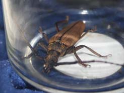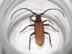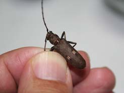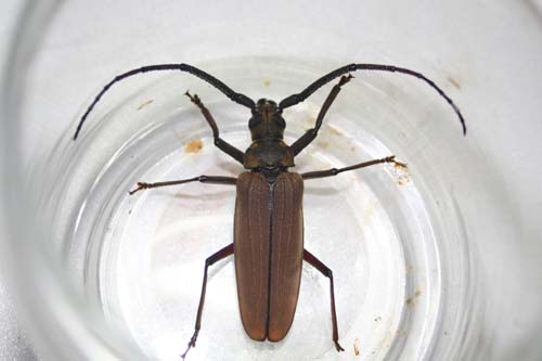 石垣島もそろそろ梅雨明け。今日は梅雨明け前にふさわしく、蒸し暑く風もない。おまけに、月齢は25とほぼ新月、完璧なライトトラップ日和です。子どもは明日は休みなので、20時過ぎいつもの野底林道へ。ライトを付けると同時に、ハネアリの群れ。蛾やコガネムシも多い。しかし俺たちの目当てはカミキリ。最初に飛んで来たのが、フタツメイエカミキリ。去年灯下で2ひき捕まえたけど、今年は初めて。それから、しばらく来ないで21時過ぎ、子どもがライトから少し離れた場所で、大型のカミキリ、ヤエヤマウスバカミキリ(55mm)を見つけた。去年に続き2匹目。自分で見つけたので子どもは大喜び。それから直ぐに飛んできたのが、この前に引き続きイシガキトゲウスバカミキリ。これもかなり嬉しい。子どもは、今日は調子が良いので、ニッポンムネヒダミヤマカミキリを捕まえるまで粘ると言ってましたが、22時過ぎに終了。ニッポンムネヒダミヤマカミキリはまたのお預けでしたが、満足の行く採集でした。