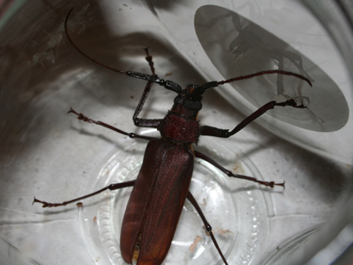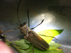梅雨明けして、初めてのライトトラップ。6月5日のライトトラップでヤエヤマウスバカミキリとヤエヤマノコギリクワガタを捕まえ良い出だしのライトトラップでしたが、その後2回のライトトラップではめぼしい昆虫は飛んで来ず、今回が今年4回目。友達家族といっしょのライトトラップです。内の虫好き息子も、目標としているニッポンムネヒダミヤマカミキリ以外の飛んできた昆虫はみんなお友達にあげると言っており、いつも2人だけのライトトラップより楽しみにしているようです。さてこのところ石垣島は風が非常に強い。今夜も強い。当然のごとくこんな日は、ライトトラップに向かないが、いっしょに出来ることもめったいにないので強行。風が強いわりには色々なコガネムシが飛来し、息子はどんどんお友達にあげたり、名前を教えたりしている。そんな中、大物飛来。イシガキクワカミキリ。私たちのライトトラップは、大物1匹でも飛んで来れば満足。息子が捕まえて友達にあげる。その後、息子がまたまた大物を発見。タイワントゲフチオオウスバカミキリ、日本最大級のカミキリ。約1年ぶりの採集。これは、息子が持って帰った。10時に終了。風が強い中、みんな満足のライトトラップでした。