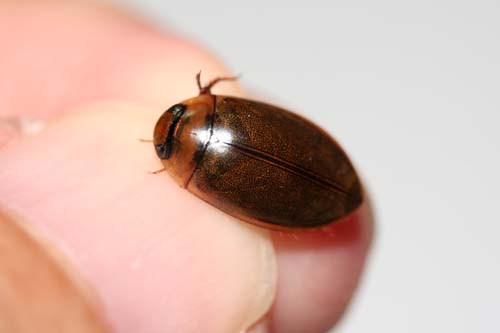 | ついちょっと前に、子どもはゲンゴロウという水の中にいる甲虫のことを知って、捕まえたいと言ってました。人に聞くと石垣島にも生息しているらしく、でも、どこにいるかわからないし、池を周って、タモ網で何回も何回もすくったりしないと捕れないと思うよ。いつか捕まえようと話していた矢先、本日、いつも行く公民館の水銀灯に飛んできました。ちょっと驚き!ゲンゴロウって、飛ぶとは思っていたけど、光にもよってくるんだ。本当にゲンゴロウだよね?(後ろ足は、まさしく水生昆虫のようにすらっとしてました。) |