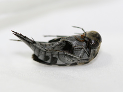 | 最近、週に1度地域の人達が集まって小学校の体育館でソフトバレーをしています。といっても、しているのはママの方で父ちゃんは子守。下の子とずっと遊んでいます。虫好きの上の子は、友達と大はしゃぎ。そんな中でも子どもが必ずすることは、窓の下の虫の死骸チェック。体育館は、クーラーも網戸もなく、夜でも暑いので必ず窓を開けます。すると多量の虫が入り込みます。昼間は締め切って暑くなり、虫たちは窓ガラスの周りで死んで、下に落ちます。それを、見て周るのです。去年は、ここでススメバチを見つけてお喜びでした。今日は、初めて見る甲虫を見つけました。ハナノミです。ずんぐりした三角形をしています。何冊かもっている虫の本の中で、ハナノミは1冊しか載ってませんでした。それほど、マイナーな虫。ども、とっても綺麗な虫です。 |