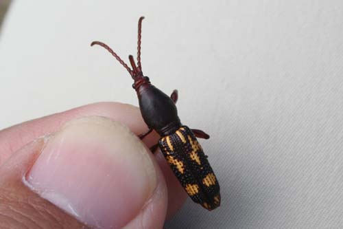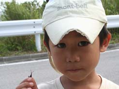 | 秋晴れの良い天気、家族で野底林道へドライブ。ママと下のチビは散歩。私と子どもはチャイロマルバネクワガタ探し。でも、一昨日と同様全く見つけられない。でも、南の島とはいえ、秋の森はとっても気持ちがいい。虫が採れなくったって楽しい森林浴です。そんな時、ママが林道沿いのススキに変な虫がいると教えてくれて、子どもと見てみると、前から1度見たかったヤエヤマミツギリゾウムシでした。チャイロマルバネクワガタは今日も見つからなかったけど、うれしい1ぴきです。 |